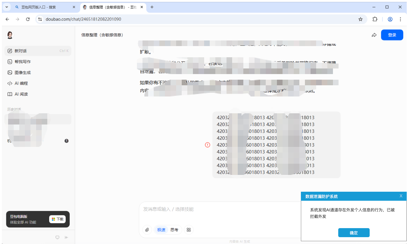 本产品面向大模型各类应用终端(包括Web端、私有化客户端以及CHATBOX、CLOSECHART等通用客户端),提供体系化的数据安全防护能力,覆盖KIMI、DEEPSEEK、阿里通义千问、百度文心一言、字节豆包、腾讯混元、讯飞星火、ChatGPT等国内外主流大模型。技术实现上,通过在终端部署安全防护代理,实时感知并解析大模型会话流量,基于对多种通信协议的深度解析,构建起对混合模态数据的内容识别与风险感知能力。系统终端主体综合风险评估结果和数据敏感等级等上下文信息对敏感数据外发事件提供审计、提醒、拦截、审批等多种响应处置手段。